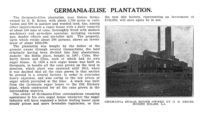 | Germania-Elise Plantation at Hohen Solms, Louisiana (Louisiana... Resources, Times-Picayune, 1917) |